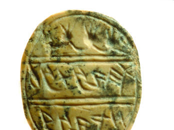 Kneeling figure praying, Hazor, first half of eighth century BCE. Raised hands are a gesture of prayer. This is on a seal impression stamped on the rim of a krater.