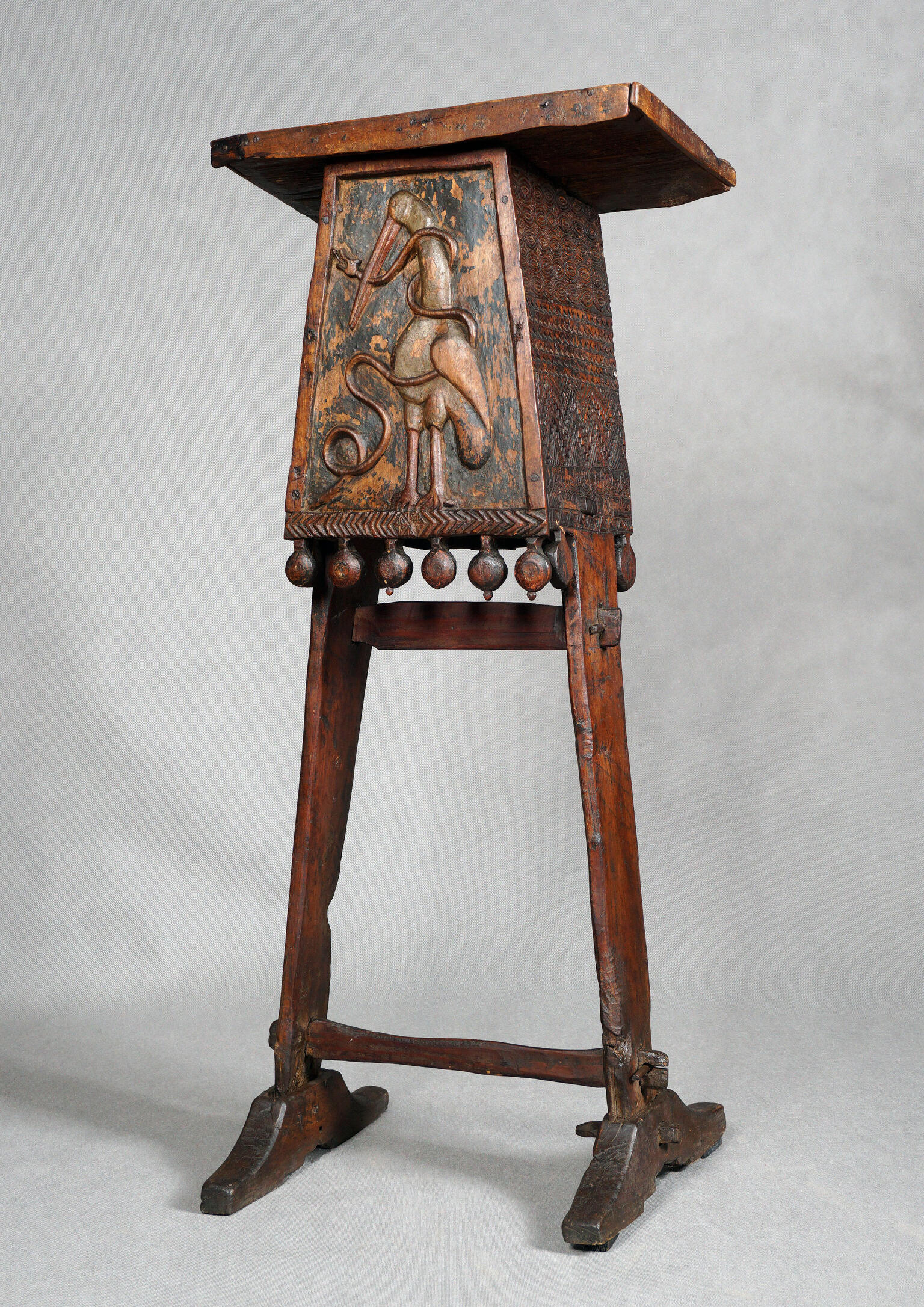 These two lecterns are from Jablonów in the southern part of eastern Galicia and may have graced the town’s wooden synagogue, which was built as early as 1674. Carved from wood, and standing on two slender legs, they are intricately adorned with a stork and a snake. Storks are called ḥasidim in Hebrew, a synonym for those who practice goodness and charity, and were also revered as symbols of good luck by non-Jews in Poland.