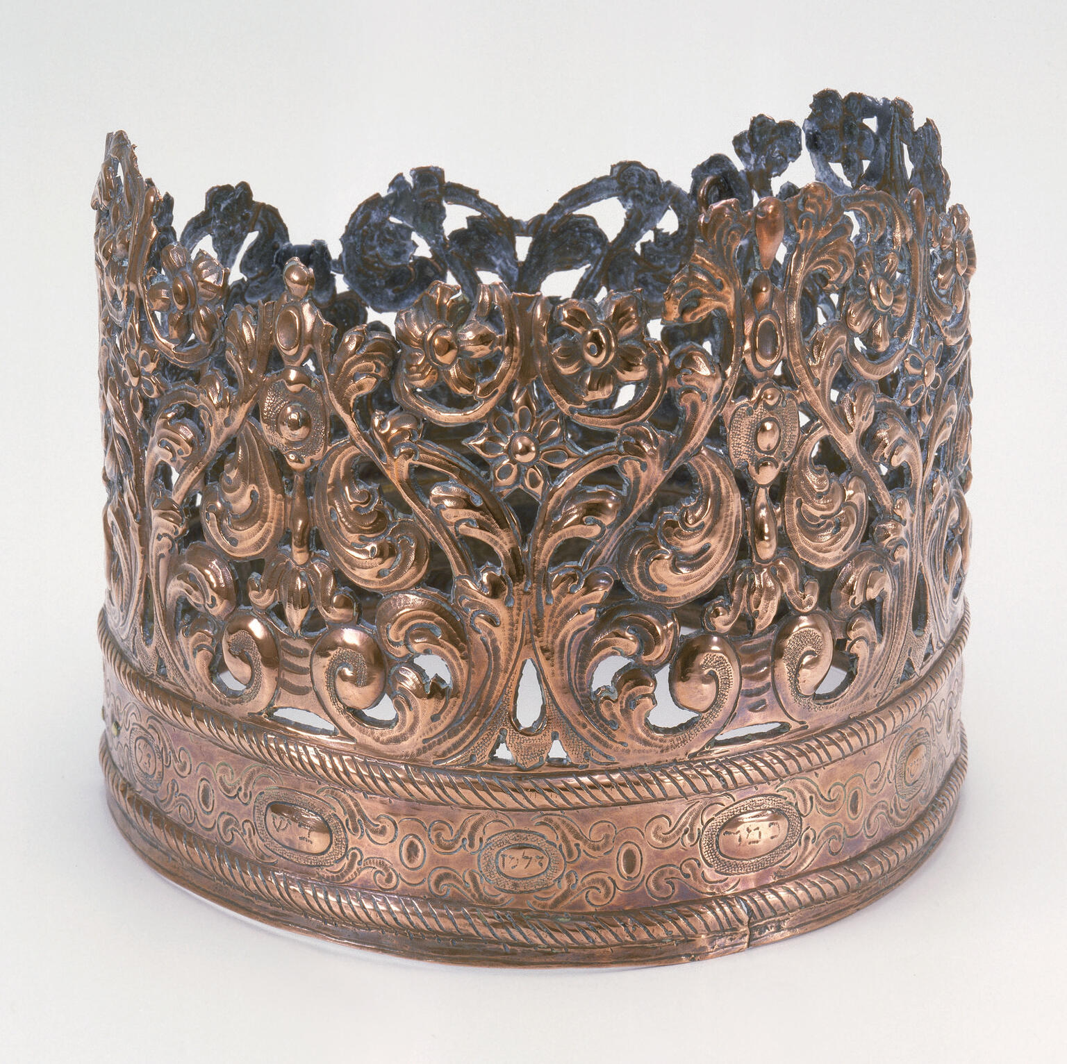 This copper Torah crown was made in Bolzano, Italy. An excellent repoussé piece, its delicate pierced and traced decorations are adorned with floral arrangements of leaves and vines. The shape of this crown, open on the top, is distinctive to Italian Torah crowns, forming what in Hebrew is called an atarah.
