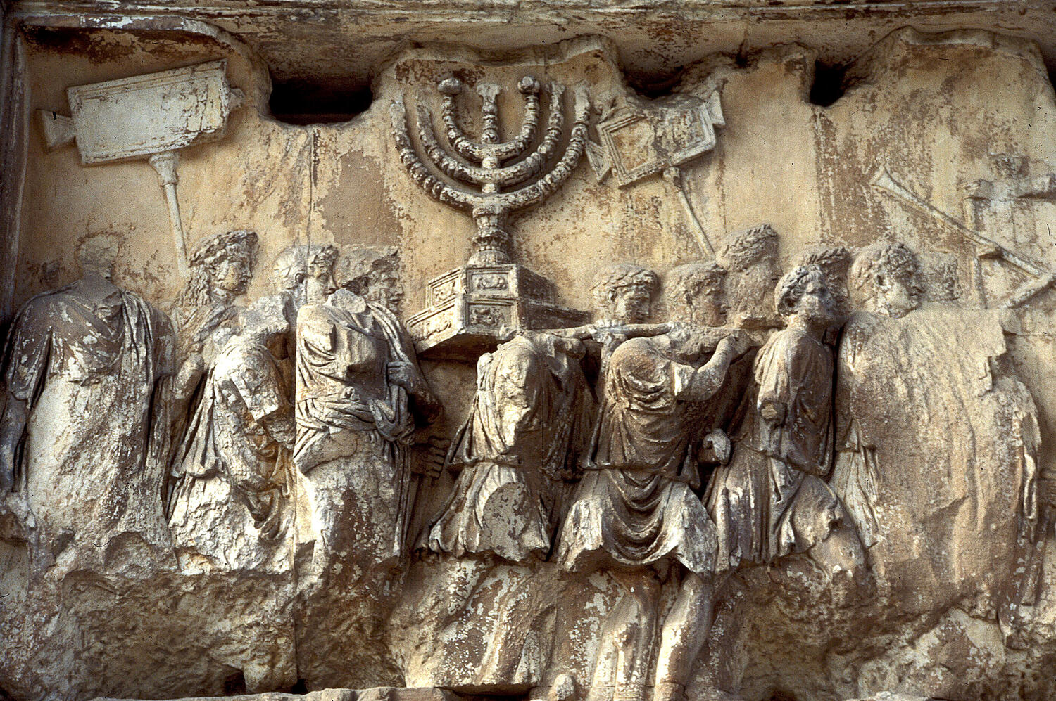 This arch was constructed by the emperor Domitian to commemorate the victory of his older brother, Titus, over the Jewish rebels in Judea. It is located on the Via Sacra in Rome and depicts the triumphal procession in 71 in which the menorah and Temple vessels were carried into Rome.