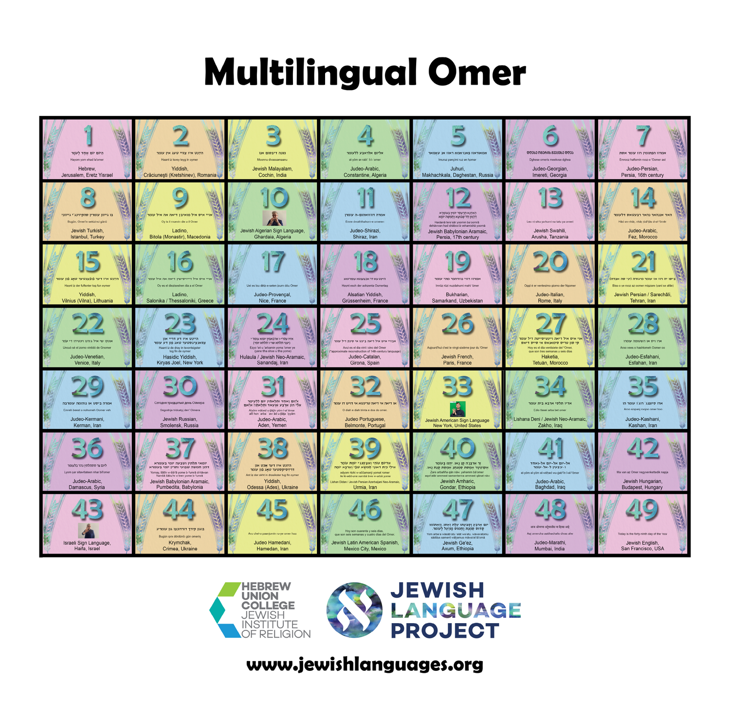 But when Jews have spoken informally about their daily counts, they have generally used their vernacular. In most places, this has been a Judaized version of the local language, such as Judeo-Italian or Judeo-Persian, but in some cases, Jews spoke a completely different language from their non-Jewish neighbors, such as Ladino or Yiddish. Diversity can also be found within languages, as each has had multiple geographically based dialects. Many of these languages and dialects are now endangered. The HUC Jewish Language Project (run by Sarah Bunin Benor) raises awareness of this linguistic diversity, in part through multilingual graphics. One of these graphics is this omer counter, which includes forty-nine of the many language varieties used by Jews. Some of the sentences in this omer counter are based on historical documentation, such as those in Ladino and Jewish Babylonian Aramaic. But most are from scholars and native speakers the Jewish Language Project’s staff reached out to asking for the count for the particular day.