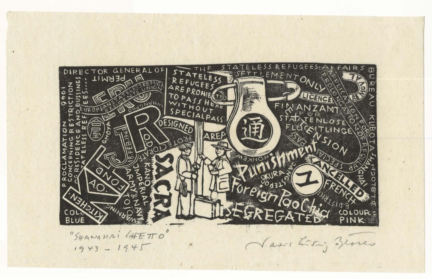 During World War II, as most nations barred Jewish refugees, Shanghai became a rare haven due to its divided international administration by British, American, French, and Japanese authorities. Between 1937 and 1941, about twenty thousand Jews found refuge there, including David Ludwig Bloch, a German lithographer and Dachau survivor. After Japan took full control of the Chinese city in 1943, authorities forced stateless Jews into the Hongkew ghetto, where harsh conditions, disease, and abuse claimed many lives. Bloch’s woodcut of presenting his pass to a guard captured the daily struggle for dignity and survival.